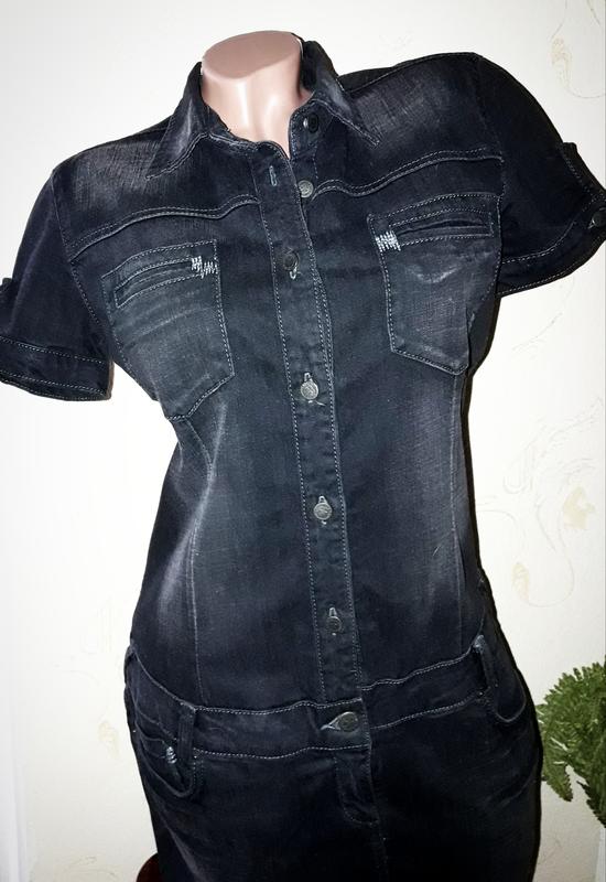 Классное джинсовое платье Цвет черно серый с легкими потертостями Бирки отсутствуют но вещь не одевалась На рукаве вырез слезкой на пуговке На уровне передних нижних карманов есть молния как в джинсах Есть шлейки для пояса ПОГ 46СМ ПОТ 42СМ ПОБ 50СМ Длина 94 см Ткань особо не тянется