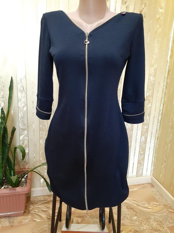 Стильное классическое платье с рукавом в три четверти, декорировано металлической позолоченной фурнитурой. Модель универсальна, отлично смотрится на любой фигурке, прекрасно дополнит как классические туфельки на шпильке, так и спортивную обувь. Для тёплых осенних деньков именно то, что нужно! И в офисе, и в аудитории, в кафе или на прогулке Вам будет одинаково комфортно в таком наряде! Цвет - темно-синий. Выполнено из плотного трикотажа (81% полиэстер,17% вискоза, 2% эластан), - немного тянется, прекрасно садится. 📐Замеры: полуобхват груди - 40-48 см (корректируется молнией, которая расстегивается), ПОТ - 35-38 см, ПОБ - 45-48 см, длина от плеча - 80 см, от подмышки - 60 см, длина рукава - 41 см Производство Турции. Размер - S или 42-44 украинский, можно на небольшую М (46). Состояние хорошее, без дефектов.