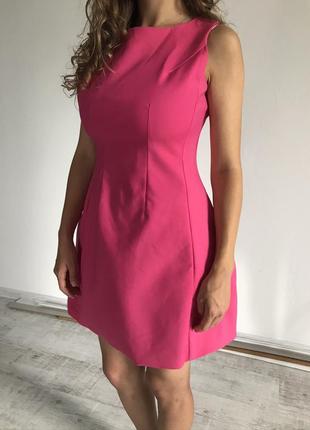 Коротка сукня-тюльпан яскраво рожевого кольору, китиці чітко тримають форму. Довжина всієї сукні - 75 см по спинці, груди - 84-90 см (тягнеться), талія - 68-72 см, бедра широкі, плаття тут лягає вільно. При потребі можу надіслати додаткові фото.