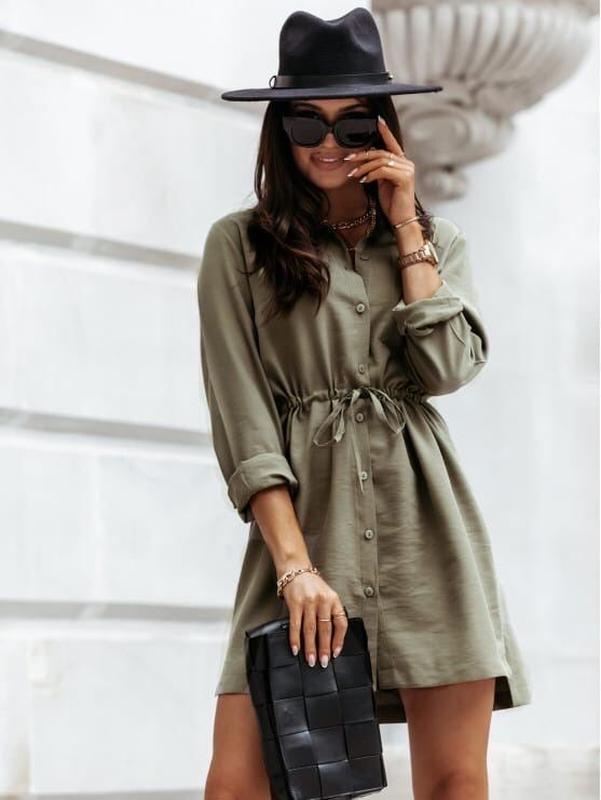 Платье Мод 7047ков Размеры 42-44, 46-48 Ткань - креп-жатка Цвета чёрный , хаки , беж Модный MUST HAVE на осень , пуговицы в тон платья , талия регулируется пояском Супер качество!