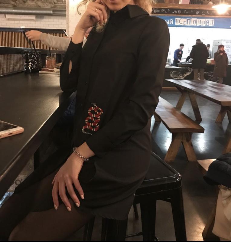 Стильное платье-рубашка с рисунком на спине, плотная ткань, не мнётся. Свободного кроя, имеются кармашки. Размер С-Л