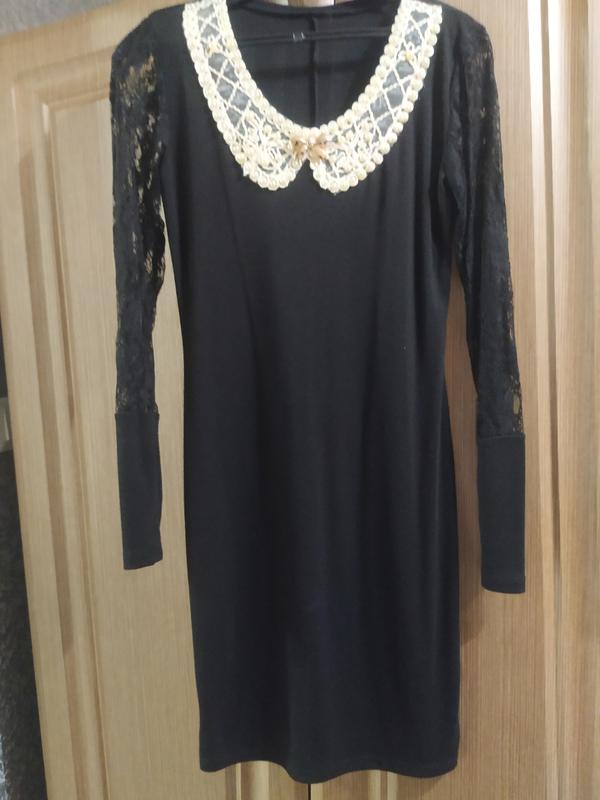 Продам чорне плаття. До коліна, майже на рівні на ріст 170 см. на рукавах гепюр. з коміром з намистин. розмір S.