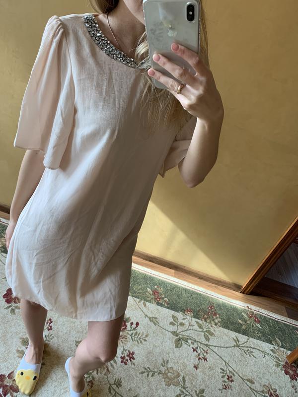 Платтячко ніжно-рожевого кольору з камінчиками у вигляді кольє. Ззаду застібається на ґудзик. Одягала 1/2 рази.