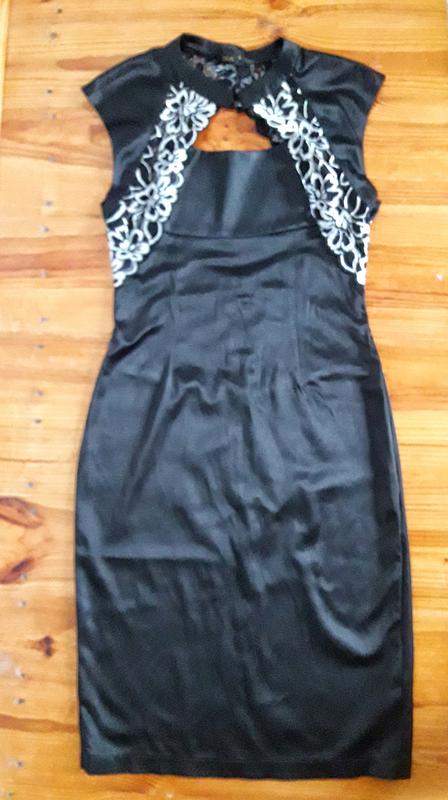 чорне плаття, атласне з гіпюром спина відкрита, дуже краствое розмір S довжина сукні 100см пог 38 піт 35 побіди 43