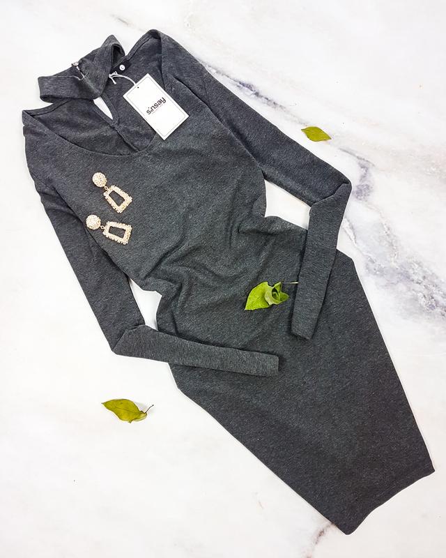 Сіра сукня з чокером Sinsay Розмір: вказано Л йде на uk 10-12 Склад тканини: 95%поліестер, 5%еластан Заміри: По плечей 37см ПОГ 44см Рукав 60см Довжина 89см