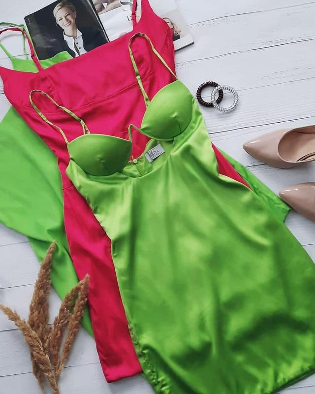 Яркое атласное салатовое мини-платье с чашечками на тонких брителях. Материал приятный к телу, немного тянется. Платье абсолютно новое, но бирочка срезана. Размер 8. Полуобхват груди - 38 см. Полуобхват талии - 29 см. Полуобхват бедер - 39 см. Длина - 77 см.