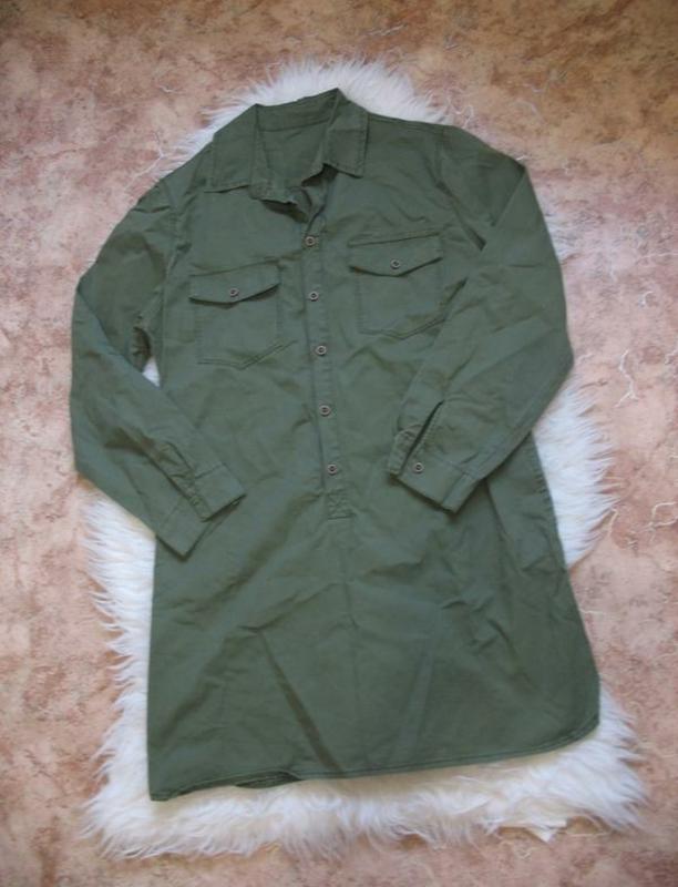 Плотное коттоновое платье-рубашка с карманами в боковых швах. Длина 88 см, пог 54 см, пот 52 см, поб 56 см, ширина плеч 41 см, длина рукава 60 см