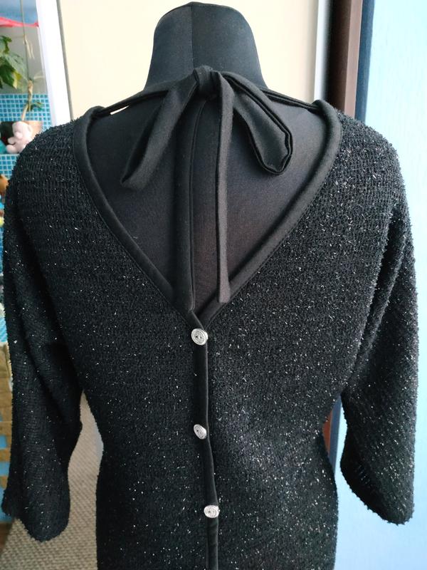 Платье с люрексом. Одела один раз на Новый год. Пог 45,Пот 41, Поб 45, длинна по спинке 86. Рукав четвертинка, тянется. Пуговицы на спинке просто для украшения. Немного колючее с изнанки, но не критично.
