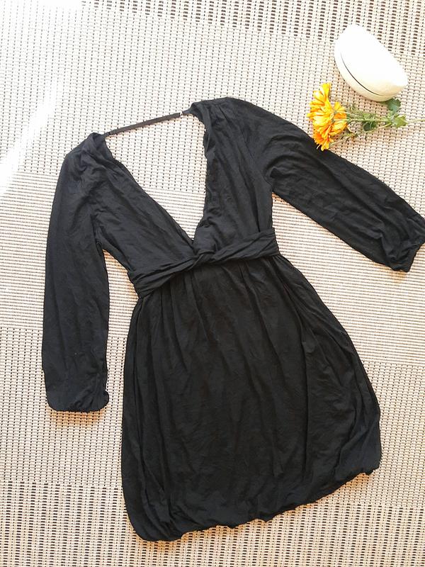 Платье черного цвета. Впереди вырез на запах, сзади треугольный. Сбоку змейка. Завязывается на атласную ленту. Дефектов нет. Италия, оригинал. 94%модал (буковая, эвкалиптовая древесина, экологична), 6%эластан. Приятная на ощупь. Указан размер 44 Длина по спинке-92 ПОГ- 42-48 ПОТ-34-38 ПОБ свободно, но максимум 46-55 Глубина выреза на груди-32 Глубина на спине-38 Ткань тянется
