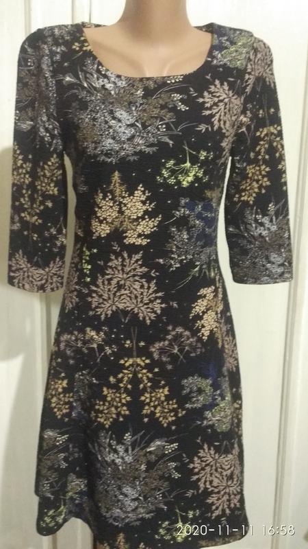 Красивое молодежное платье трапеция.Размер 8,рукав укороченный.Замеры: пог-41,пот-38,поб-46, плечи-35.Длина руава-43.Длина платья-87.Ткань полиэстер,тянется,средней плотности.