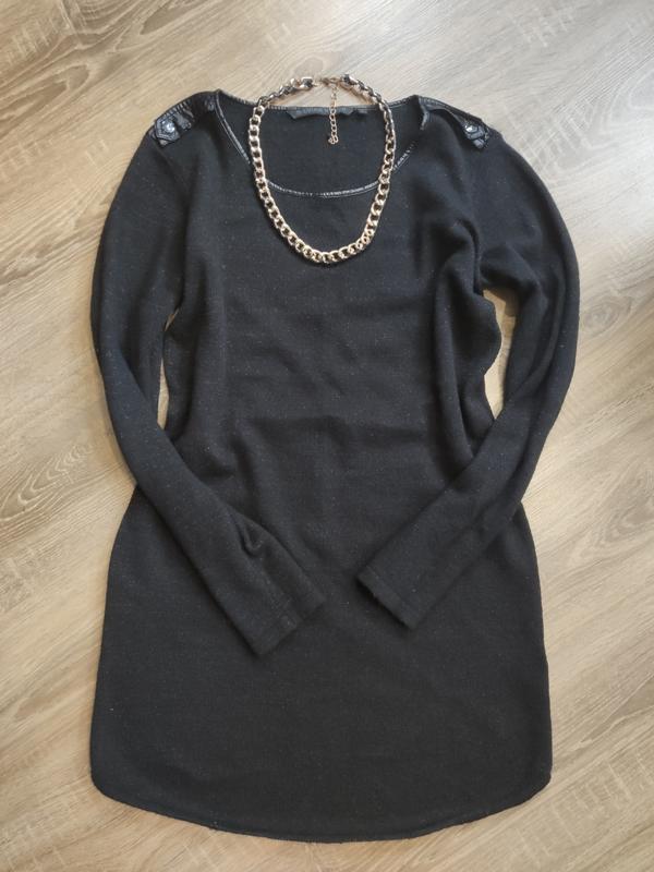 Отличное базовое платье . Теплое с люрексовой нитье. На плечах отделка из кожи на кнопке. смотрится очень стильно и аккуратно. замеры на фото.