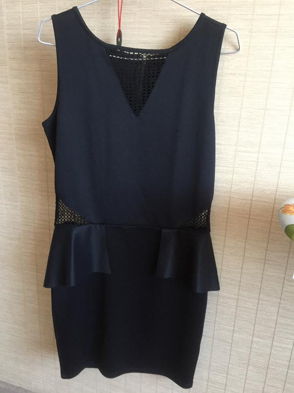 черное коктельное платье с баской, взади молния до пояса, на груди и по бокам оригинальные вставочки из сеточки