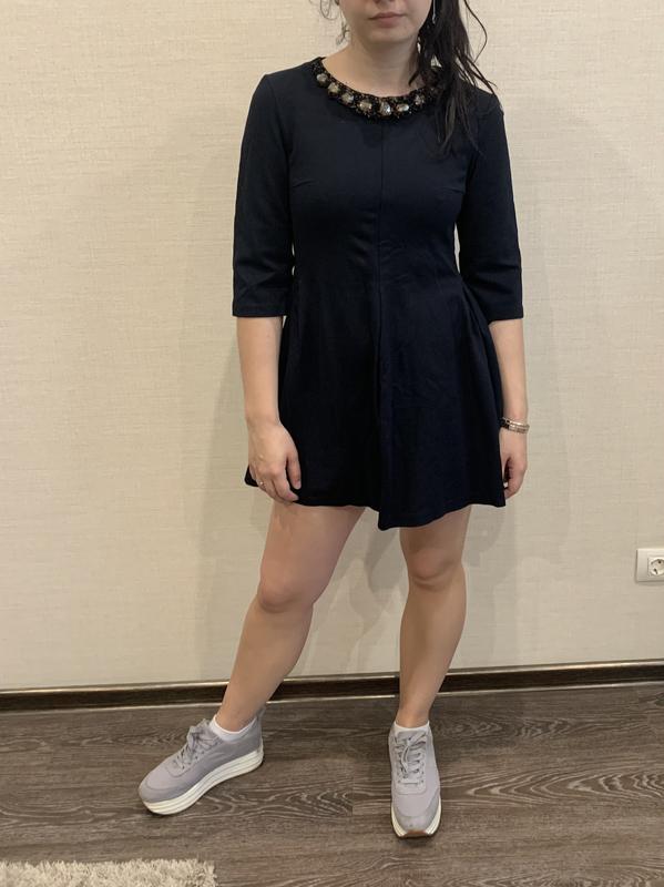 Короткое темно синего цвета платье с красивым ожерельем . Неполноценный рукав.