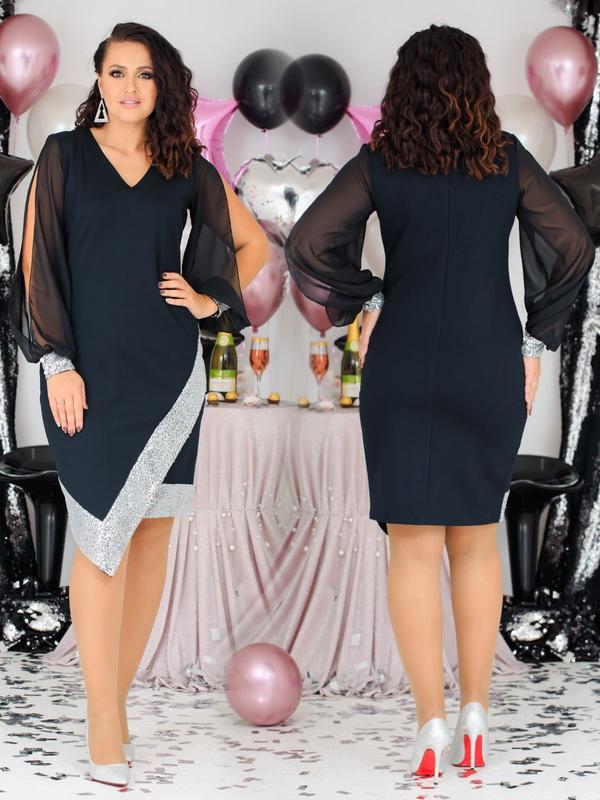 Платье. # 808 (Ал-Коз) Цена: 600 грн. Размеры: 48, 50, 52, 54, 56, 58 Ткань: трикотаж Алекс (турция), шифон и пайетка. Длина платья спереди: 114см Длина платья сзади: 100см Длина рукава: 64см Параметры модели на момент съёмки: ОГ: 96см ОТ: 80см ОБ: 110см. Рост модели 176см Дополнительные характеристики: платье приталенного кроя с V- образным вырезом. Рукава с прорезами по длине. Подол платья и манжеты декорированы пайеткой. Сзади на потайной молнии. Цвет - чёрный и синий.