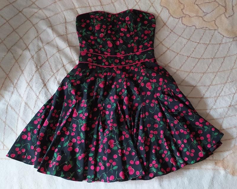 Дуже красива сукня у відмінному стані. Одягалась кілька разів. Верх без бретельок, корсет. Спідниця широка - сонце. Дуже красивий принт у вишеньки. ПОГ - 38 см (але реально на об'єм 80-84 см) ПОТ - 32 см