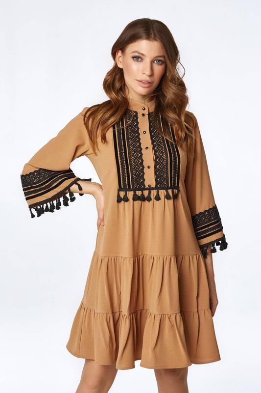 Платье в этно стиле. Размеры: М-ХЛ. На манекене размера М платье Л\ХЛ. Цвета только кофейный Полочка украшена декоративной тесьмой и натуральным кружевом и функциональными кнопками. Ткань: легкая костюмка. Цена распродажи: 590грн..
