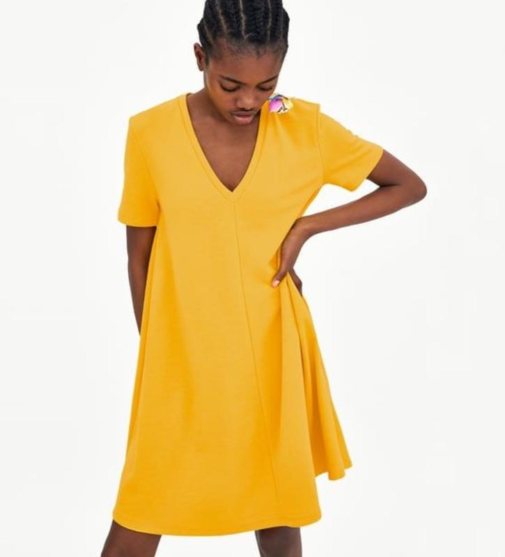 яскрава жовта сукня від Zara з V вирізом вільного крою, тканина котон, плотна, розмір вказано S, ПО грудей 45 см і вільно розширюється до низу, довжина 80 см