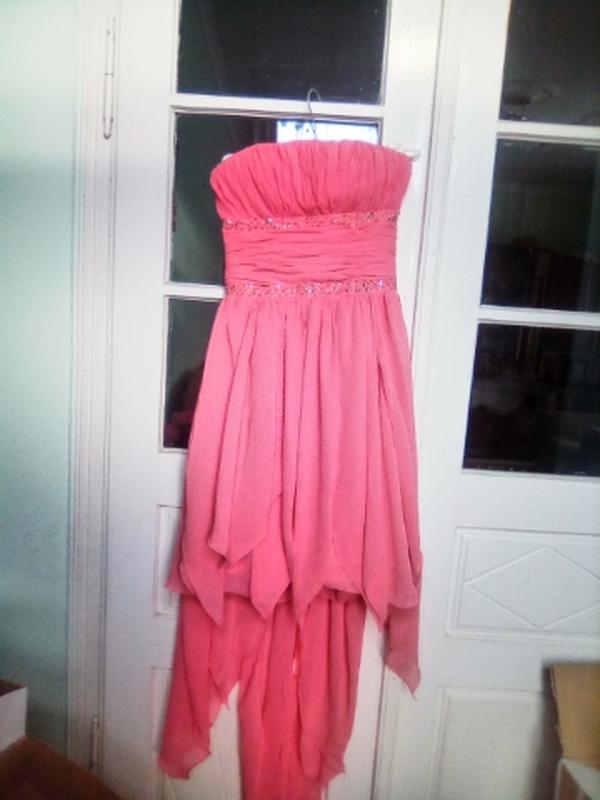 красивое праздничное платье двухслойное и верх украшен полосками ткани (фестонами), спереди короткими,сзади длинными.юбка состоит из верхнего тоненького материала,потом слой из материала типа атласа с подкладкой,а самый верхний слой фестоны, которые будут разлетаться при ходьбе.пояс украшен паетками с бисером.длинна спереди 73см., сзади 130см.(фестоны),пояс 30см., грудь 35см.,вшиты чашечки,сзади до самого конца лифа идёт шнуровка.