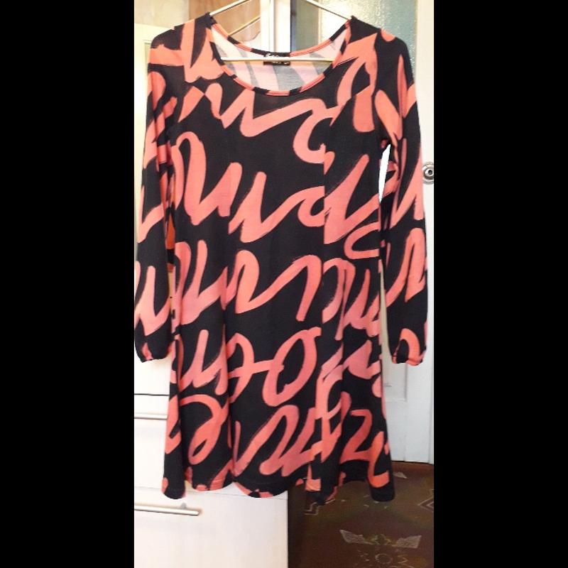 Демисезонное платьице с интересным принтом.Удачный крой,не облегает и в тоже время делает фигурку женственной,внизу немного разклешенное.