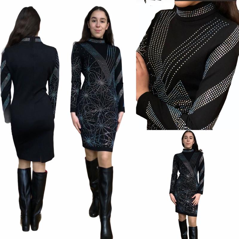Дуже гарна сукня, оздоблена камінцями. Тканина щільний трикотаж, ідеально підкреслює фігуру. У розмірах: М, Л, ХЛ M: пог 41, поб 43, довжина 92 Л: пог 43, поб 45, довжина 93 ХЛ: пог 45, поб 47, довжина 94 см Тканина добре тягнеться.