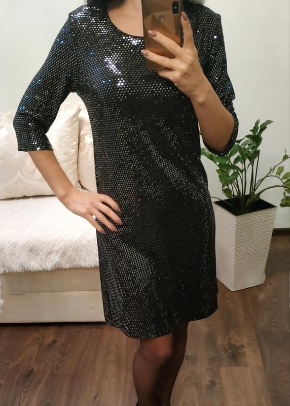 Плаття пряме в паєтки вільного крою. В чорному кольорі. Розмір 44-46. Заміри: Плечі - 38 див. ОГ - 92 см ВІД - 86см. ПРО - 96см. Довжина - 88см. Рукав - 38см.