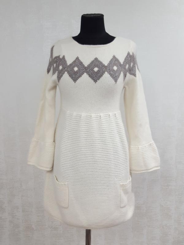 Нарядное трикотажное платье молочно-белого цвета из шерсти и ангоры.Линия талии чуть завышена,юбка присборена.Комбинируется продольная и поперечная вязка. По линии груди и рукавам вывязан красивый орнамент. Низ рукава оформлен пышным манжетом. Внизу платья два накладных кармана. Размер XS пог 36-40см пот 35-38см поб 50-56см др 54см ди 81см Будет ещё много фирменных вещей. Подписывайтесь! Я только стартую! Имейте ввиду, что пока вы добавляете товар в ''избранное '',кто-то его уже покупает.И вы можете упустить свой шанс приобрести понравившуюся вещь. Дешевле покупать сразу несколько вещей-таким образом вы экономите на доставке.При покупке трёх и более вещей доставка бесплатная. Удачных и приятных покупок!
