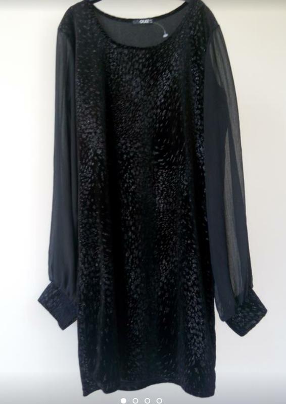 Гарне,велюрове з легким напиленням блиску.Рукав прозорий ,з велюровим манжетом.Нове без бірки.Довжина сукні 87см.
