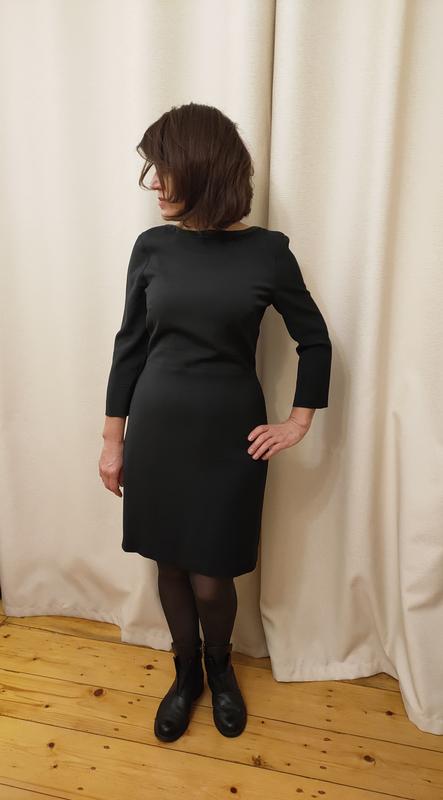Классическое маленькое чёрное платье вне времени и моды! Очень элегантное, за счёт правильного кроя подчеркивает хрупкость фигуры. Милая изюминка - вырез на спинке. Горловина обработана широким кантом. Платье мое, состояние безупречное. На фото видно, что мне маловато. Длина 94, ОГ (между проймами 45), ОТ 37, ОБ 48.