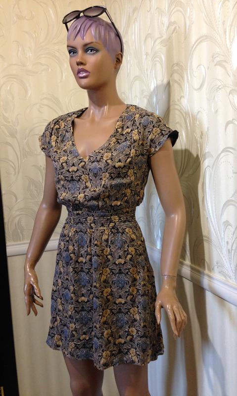 Літнє плаття в квітковий принт, V-подібним вирізом, вільного крою, спущеною лінією плеча, на талії акуратний вшитий пояс, на підкладці. Бренд MANGO. Склад: виріб - 88% віскоза, 12% вовна; підкладка - 100% ПЕ. Розмір EUR-XS, можна розглядати S. Стан нове всі бирки в наявності. Заміри: плечі - 36 см, ПОГ - 46 див., ПОТ - 31 див., ПОБІДИ - 47 див, довжина - 87 див. Ласкаво просимо в мій магазин. Відомі бренди, відмінна якість - доступні ціни.
