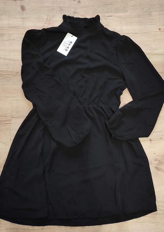 Чорне міні-сукні з високим вирізом. Ззаду застібається на гудзику. Пухкі і розлитаючи рукава. Манжет на гумці і на талії теж, який добре підкреслює фігуру. Довжина - міні. Тканина - шифон. Розмір - 40 європейський