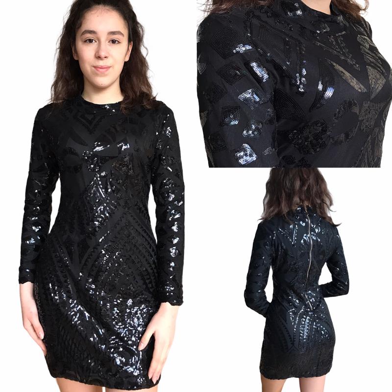 Дуже гарна чорна сукня, розшита паєтками. Розміри S,M. S: ПОГ 42см, ПОТ 37см, ПОБ 44см, рукав 57см, довжина 81см М: ПОГ 46см, ПОТ 39, ПОБ 48, рукав 55, довжина 84см