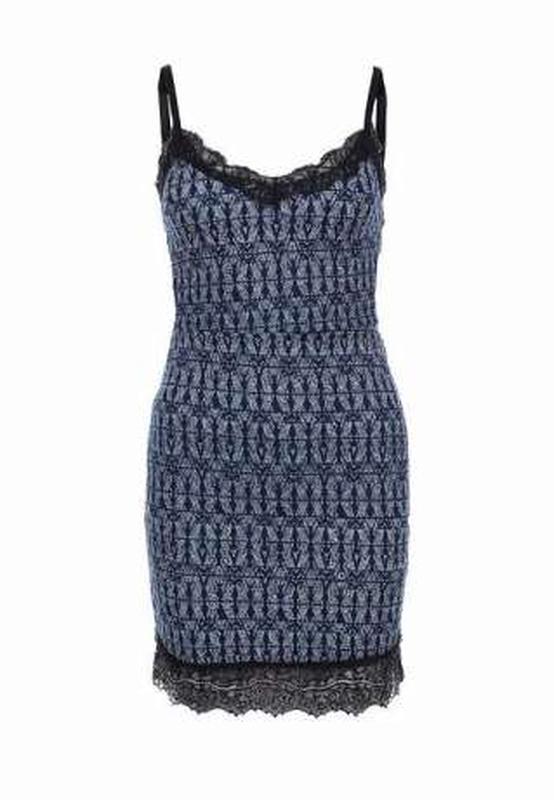 Платье от Jennyfer выполнено из мягкого на ощупь эластичного материала синего цвета. Модель прилегающего силуэта. Детали: V-образный вырез; эластичные регулируемые бретели; потайная застежка на молнию на спинке; геометрический узор; черные кружевные вставки.