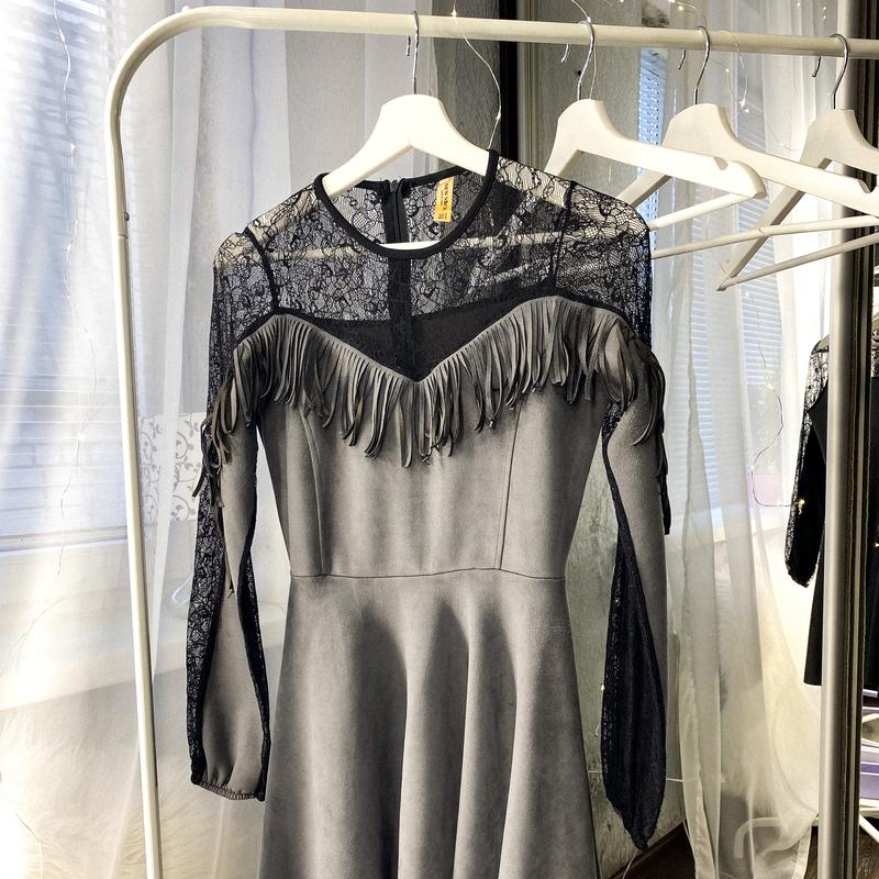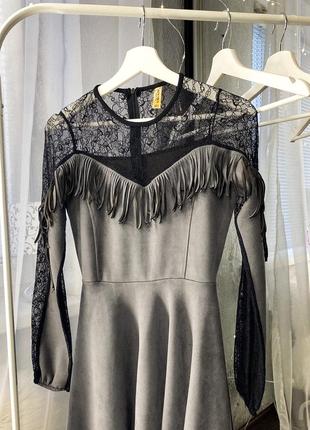 Шикарное замшевое серое платье с декоративными рюшами + плотной сеткой. Размер
