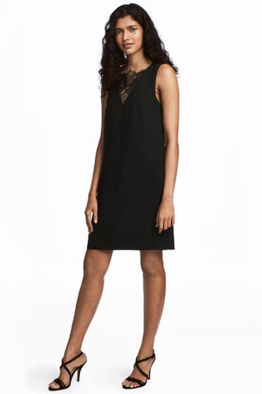 платье от бренда H&M разм. 38 № 0524302002 Мерки: пог 46см, длина 91см Короткое платье из креповой ткани; треугольный, обшитый кружевом вырез спереди; вырез сзади сверху на пуговице; прямая посадка; на подкладке. Состав: 100% полиэстер; кружево: 100% полиамид