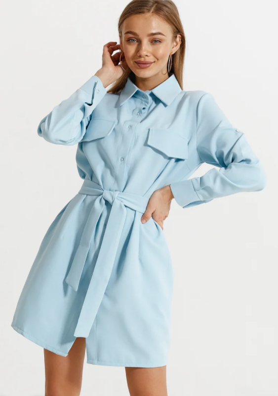 Сукня-сорочка ніжного блакитного кольору, з відкладним коміром, довгим рукавом із застібкою-пати, нагрудними кишенями-обманками, двома кишенями у швах і знімним поясом в тон. Колір: блакитний Матеріал: креп-костюмка Склад: поліестер 80% нейлон 18% лайкра 2%