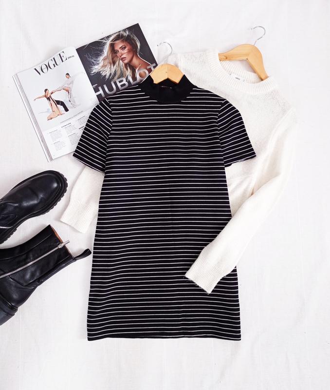полосате плаття А-силуету від Zara з манжетом навколо шиї, тканина плотний трикотаж, тягнеться, розмір S, З грудей 46 см, довжина 75 см
