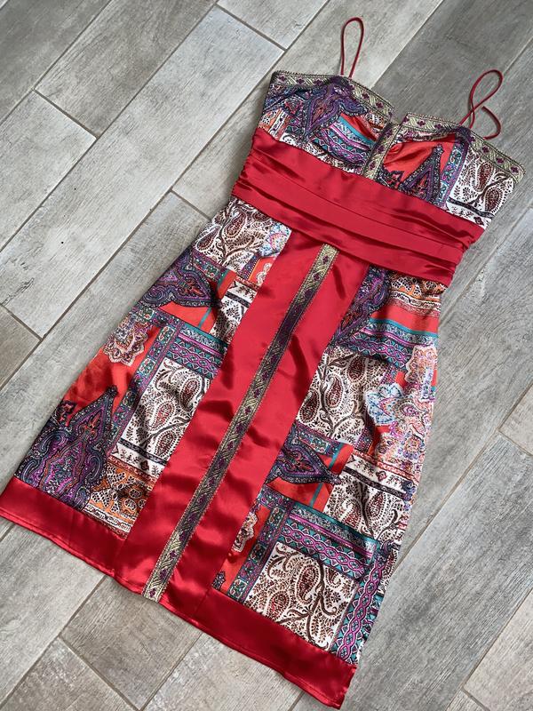 Красное атласное мини платье,платочный принт,шёлковое платье(010)