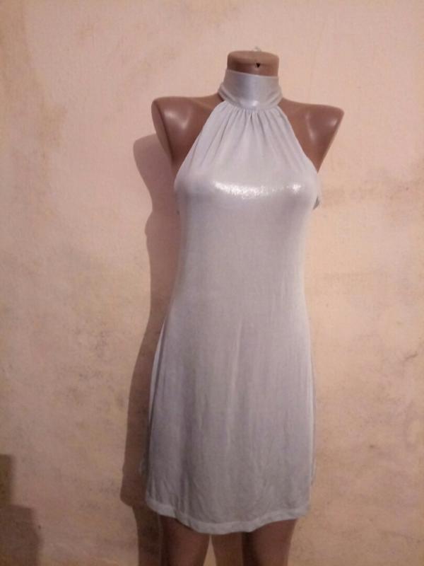 платье-сарафан серебристого цвета, без подклада, присобранный круглый вырез горловины с воротом под горло, который переходит в завязку на шее, без рукавов, короткое. Отправка Укрпочтой или Новой почтой.