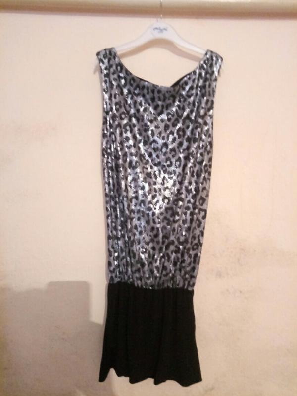 нарядное платье черного цвета с леопардовыми пайетками серебристо-черного цвета впереди, вырез горловины "лодочка" со слегка свисающим краем, без рукавов, средняя ширина линия плеча, на подкладе, обтягивающая двойная юбка, очень оригинальная спинка: глубокий вырез со свободно спадающей тканью (присобрана), вверху по спинке перекрестные резинки, по длине - мини. Отправка Укрпочтой или Новой почтой.