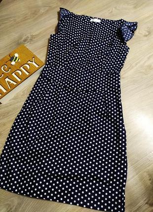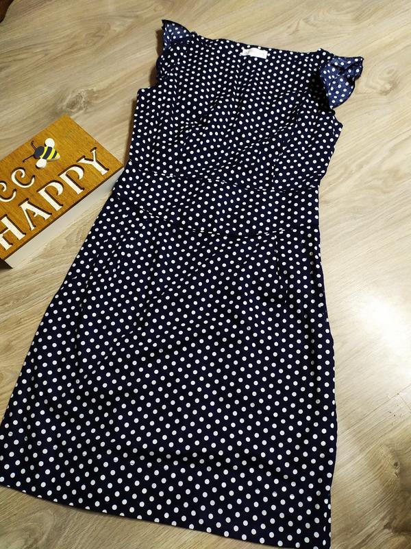 Таке стильне і завжди актуальне плаття в білий горошок для святкових і повсякденних виходів. Плаття облягаюче в грудях і бедрах. Гарно сідає по фігурі. Низ відокремлений вшитим розширеним поясом. Зручно одягати і знімати завдяки тому, що збоку є потаємний замок "змійка". На бірці вказано розмір S (європейський 8). Ще один плюс - є два кармани і рукавчики ідуть воланами. Склад 100,%котон. На вигляд як нове.