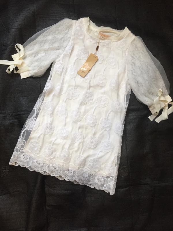Платье белое кружевное, гипюр, сетка, тюлевое, рукава буфы фонари, цветы
