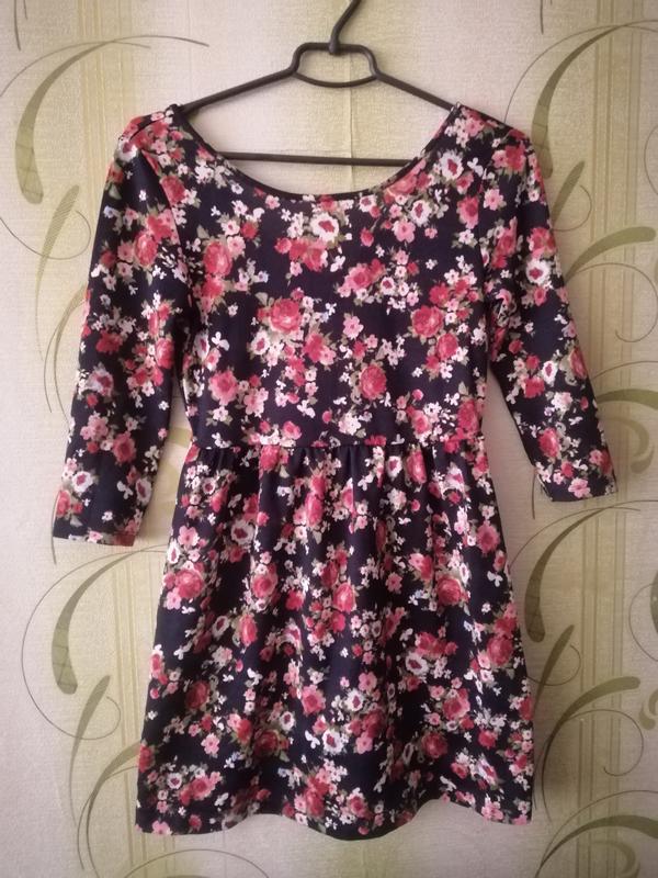 Трикотажное платье с цветочным принятом, юбка в складочку немного пышная, рукав за локоть, на спине треугольным вырез. Состояние просто отличное