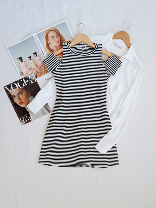 плаття в полоску від Zara А силуету, тканина плотна, добре тягнеться, розмір вказано S, ПО грудей 40 см тягнеться до 48 см, довжина 78 см