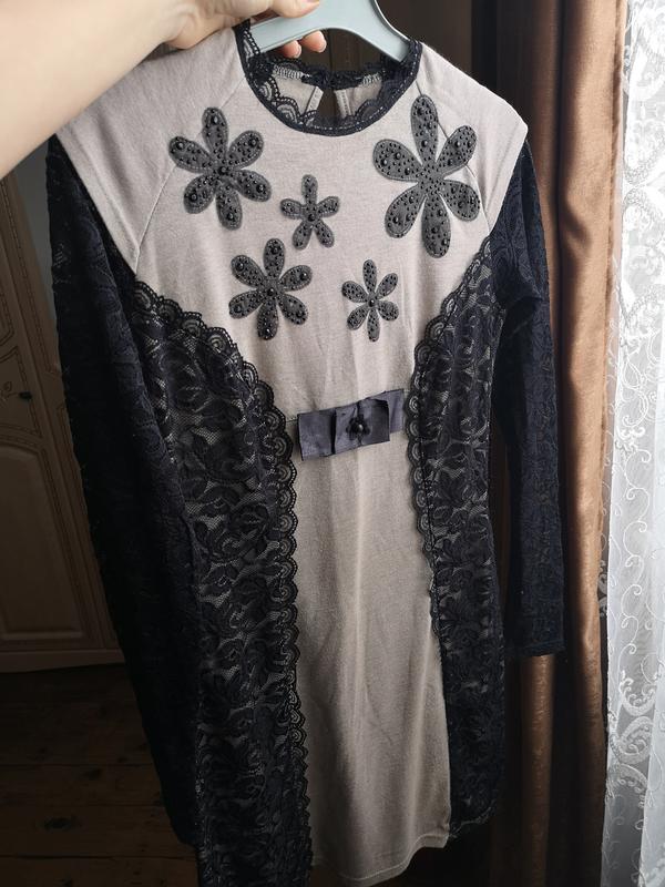 Шикарное платье по фигуре, тёплое, материал приятный к телу, отлично будет на весну или осень. Рукава ажурные, длинные. Размер S, можно и на М. Есть минимальные дефекты: некоторые камушки отсутствуют (в носке не заметно). Доставка: Укрпочта или Новая Почта. Оплата: 100% на карту ПриватБанка. Порядочность гарантирую.
