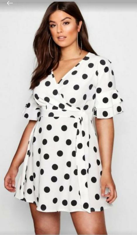 белое платье boohoo в горох р.20( р.52-54) в отличном состоянии, хорошо тянется. замеры длина от плеча 90 см, ПОГ 55см( тянется до 62см),ПОТ 45 см( тянется до 53см),ПОБ 63 см( тянется до 74см), рукав 28 см.