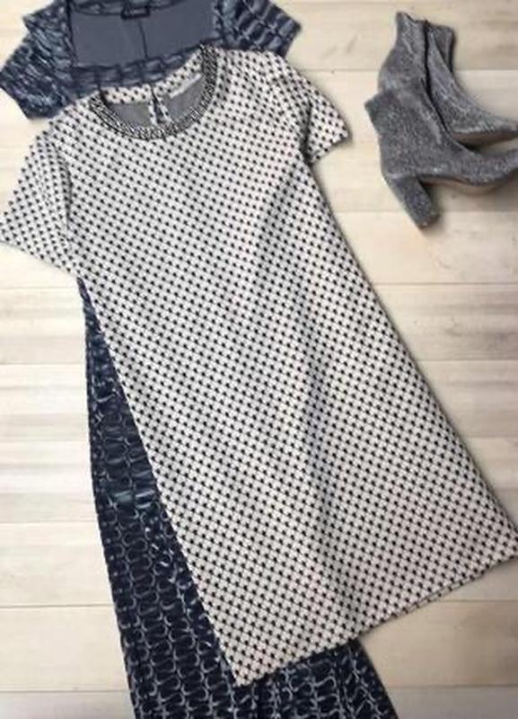 Стильное платье ровного кроя на горловине украшение ткань фактурная плотная. Длина 99; Плечевая 43 тянется; ПОГ 62; ПОТ 60; ПОБ 66.