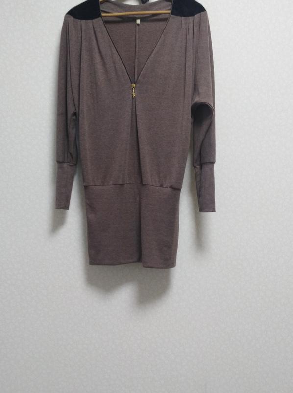 Платье туника удобное, мягкое, замеры по запросу, верх более свободно, вниз по бедрам, можно как платье, если кто носит короткие платья, плечи черного цвета,рукав широкий, зауженный к краю,груды можно регулировать застежкой, приятный цвет молочного кофе