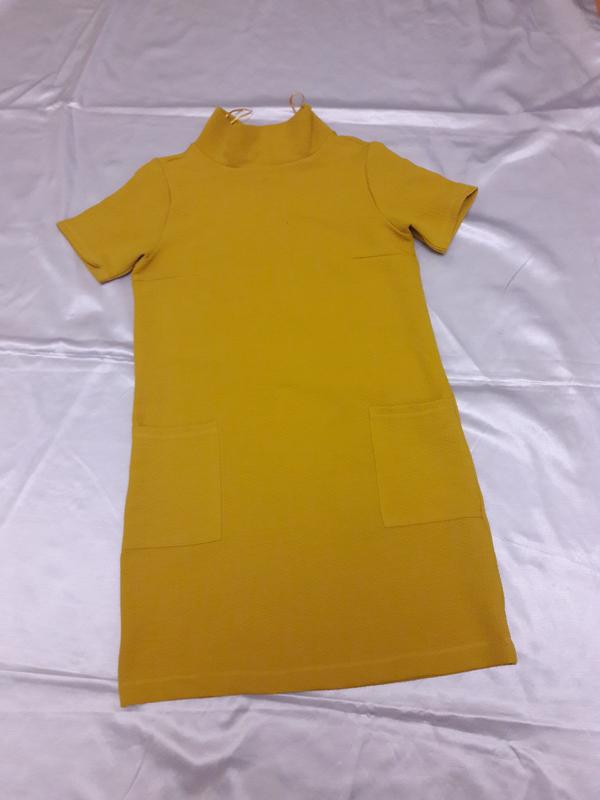 Платье желтого цвета из плотной рельефной ткани 95 % полиестер, 5% эластан. Бренд Tu. размер 14. ПОГ 50 см, ПОБ 53 см, длина 95 см. Дефект - точечное пятнышко красного цвета на груди 1- 2 мм.