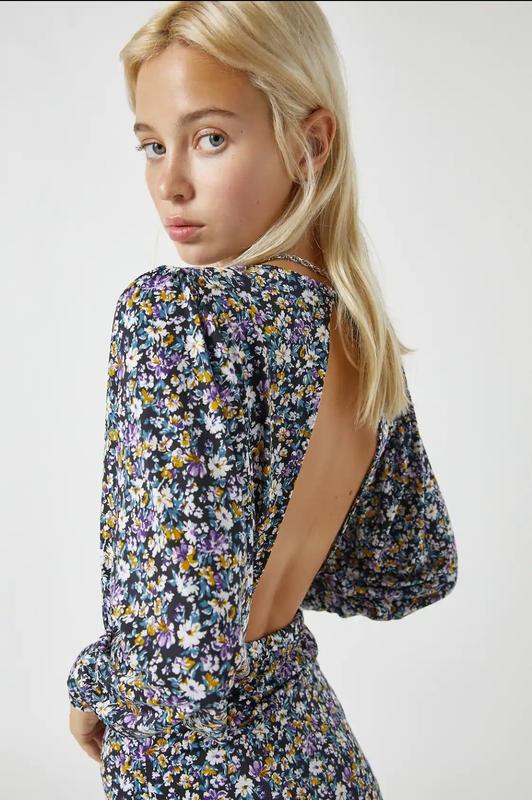 Платье с принтом, открытой спинкой, круглым воротником и длинными рукавами. Имеет сборки на воротнике, эластичный пояс и подкладку. Ткань с легким эластичным эффектом.