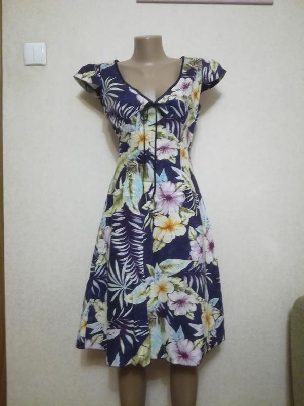 Льняное платье с цветочным орнаментом, р.S, сбоку молния Длина - 100см ПОГ - 44см ПОТ - 37см